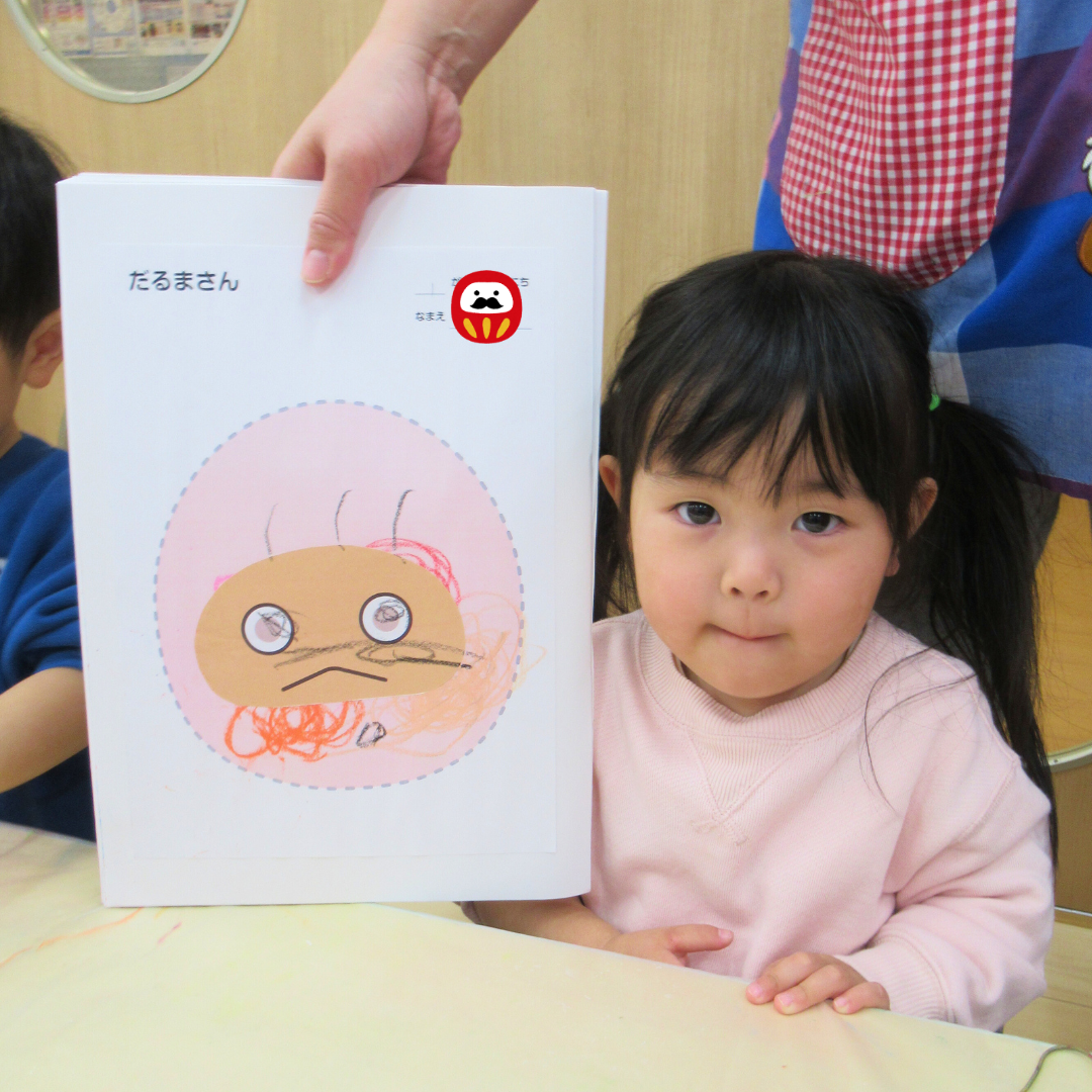 だるまさんの体を塗って、お顔も描いたよ✨個性豊かなかわいいだるまさんが出来上がりました😊❤️